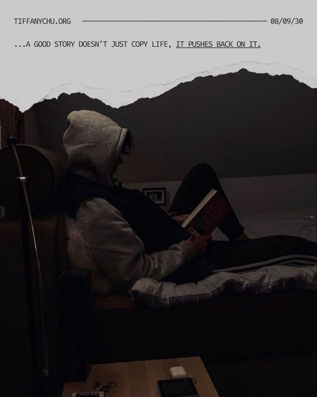 I finished Part II. This part hit really close to home for me in many ways. (SPOILER ALERT) At the end of chapter 10, Kimberly shares about volunteering her budding film-making skills for a grief support organisation. She writes about developing a theatre troupe, and a group of young adults who perform a skit about grief. In one part of the skit, the actors go, "Turn around if you'd give up everything you've learned since your person died, in order to have them back," and none of them turn. The idea being that in spite of the pain and heartache, grief made them better people.